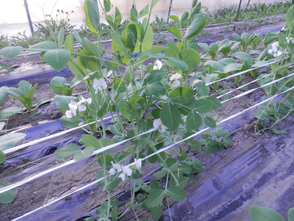 3/5に種まきをして、3/21に畑に定植した”えんどう豆”の花が咲き始めました。一緒に植えた”スナップエンドウ”や”ささぎ豆”は花が見えていませんが、低温に強いえんどう豆は朝晩の寒さの中でもグングンと成長を続けています。通常では開花から10日~2週間程度で収穫時期となりますので、4月下旬には収穫開始となりそうです。スナップエンドウは現在つぼみの見え始めで、豆類の中では高温性のささぎ豆・いんげん豆は、つぼみも見えていませんので、しばらく出荷に時間がかかりそうです。春の寒さの中で育ったえんどう豆は、鮮やかな光沢のある莢になりますので、ご期待ください。