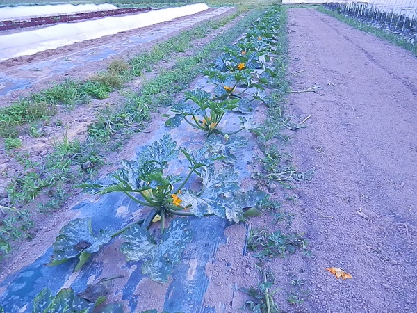 5月上旬に種まきをしたズッキーニが、収穫時期を迎えました。当農場でのズッキーニは全て露地栽培となっています。以前はハウス内でも栽培したことがあるのですが、通気性が悪く、早くから「うどんこ病」が蔓延するため、露地のみで栽培をしています。(まぁ、露地だから病気にならないかと言えばそういうことも無いのですが、閉鎖空間であるハウス内よりは病気の発生は抑えられます。)5月の低温で根張りが悪かったのか最近の高温・干ばつで日中に少し萎れることが多いのですが、実は順調に収穫できそうです。ズッキーニを栽培しているため気付いたのですが、今年は「ミツバチ」など受粉を手伝ってくれる虫たちが、例年に比べてものすごく少ないです。いつもは受粉を蜂にお任せするのですが、今年は毎朝(5:00~7:00くらいの受粉が一番安定します)自分で受粉作業を行っています。そういえば、蝶々やハエなど他の虫も少ない気がしますし、カエルの大合唱もいつもより声が小さい気がします。5月の寒さで発生時期が遅れたのでしょうか? ズッキーニについては、9月下旬までの収穫を予定しています。