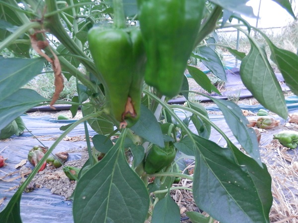 北海道だというのに、旭川は今日まで25日連続の真夏日。これは歴代最長記録だそうで今も更新中です。北海道内陸に位置する旭川市はたしかに道内でも夏の気温は高めの方ですが、こんなに暑いことはありません。経験したことのない暑さの中、みなみなふぁーむの作物はスクスクと育っており、果菜類の収穫最盛期を迎えています。特にトマト・ミニトマトはこれから9月にかけて収穫のピークとなりますし、ししとう・なんばん、オクラもまだまだ元気一杯です。ただピーマンでは写真のように、あまりの高温により根からの水分吸収が葉からの蒸散に追いつかず「尻腐れ」という症状がでています。野菜たちもきっと暑さを感じているのでしょうね。