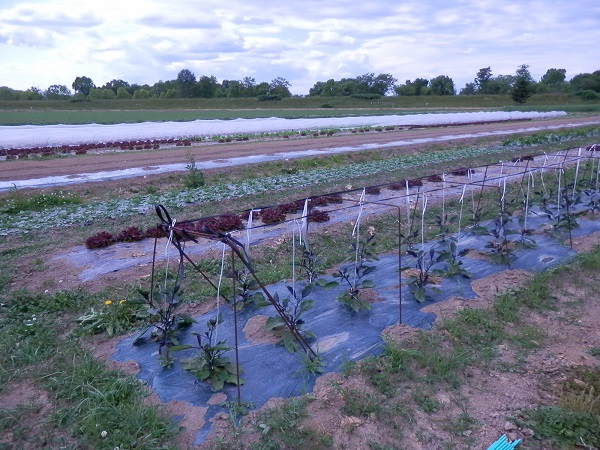写真は露地の現在の様子です。面積は20a(2000㎡)ほどの小さい区画ですが、その中になすび・ズッキーニなど、たっぷりの水分が必要な果菜類、じゃがいも・人参・玉ねぎ・大根などの根菜類、暑さが苦手でハウスで栽培しづらいサニーレタスや水菜などの葉物野菜が所狭しと並んでいます。奥の方に見えるトンネルは、葉物野菜をアオムシなどの虫から守る防虫ネットです。ズッキーニやなすびも花を咲かせており、収穫が間近に迫ってきています。また、葉物野菜は7~10日に1回くらいの間隔で幅2m×長さ50mの区画にレタスや水菜、しろ菜などの葉物を植えていますので、順次収穫を進めています。今年の6月は降雨が少なく、干ばつ気味になっていますが、無肥料自然農法での栽培では根がしっかり張っていくので、スクスクと成長を続けています。5月に植えたじゃがいもは現在花盛りですし、露地の方もハウスに負けず賑やかになってきました。